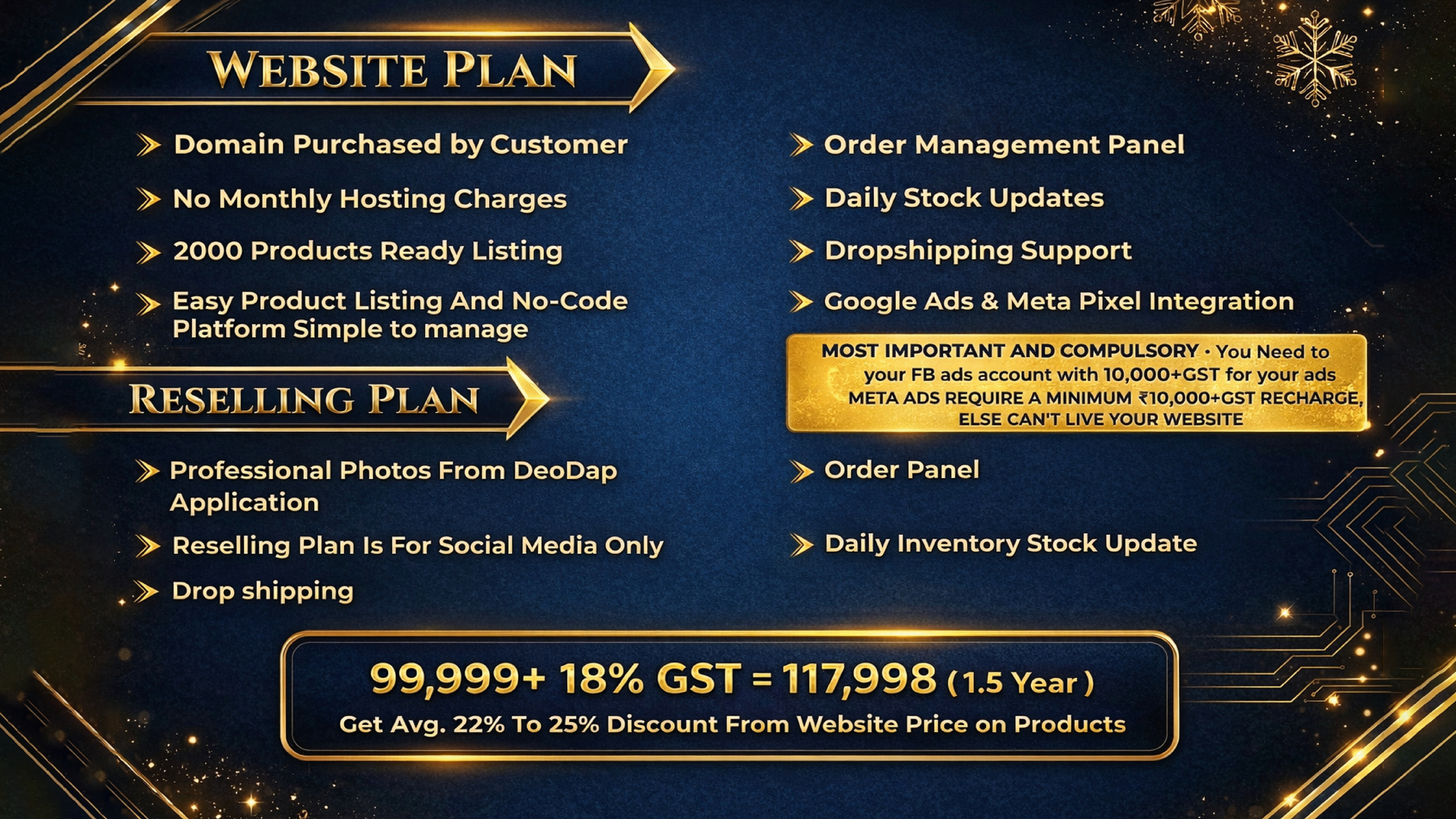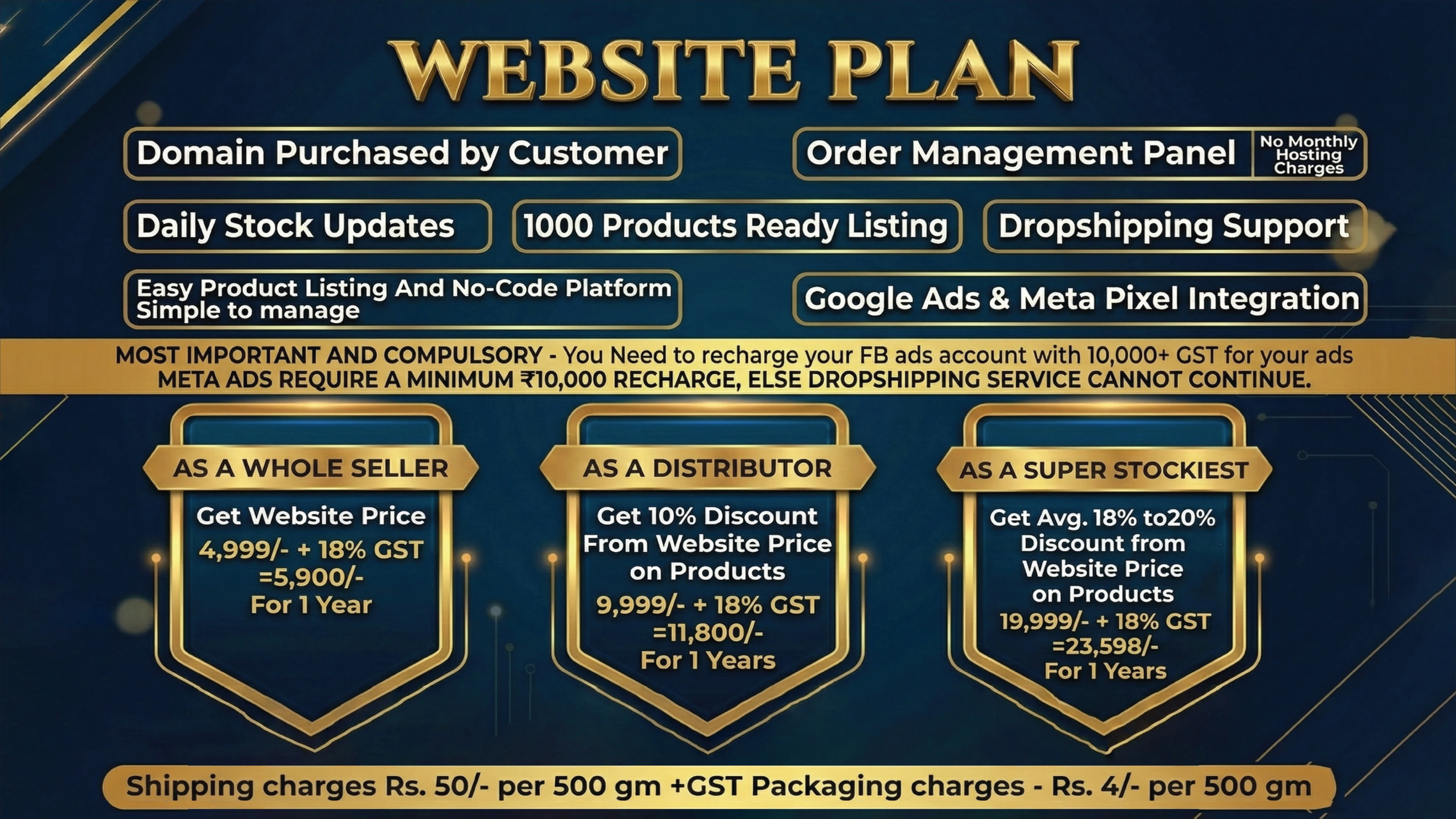 Additionally, our marketing team can run Meta (Facebook & Instagram) ads for you. All you need to do is recharge your Facebook ad account with ₹10,000 + GST, and we will handle the ad setup, targeting, and optimization to help you reach the right audience and boost your sales.